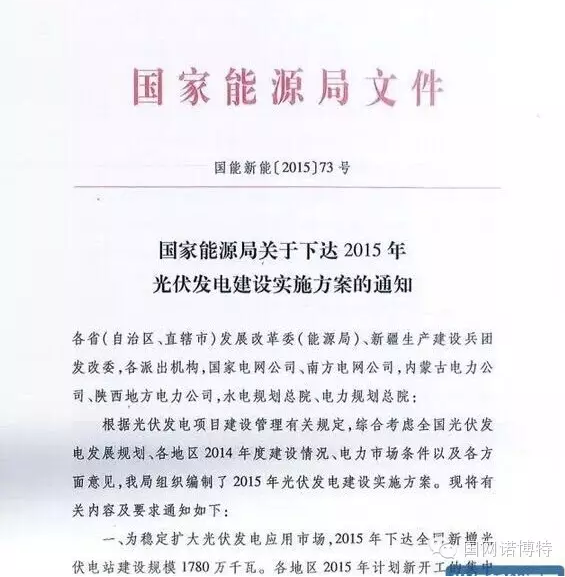 消息:2015年3月16日,國家能源局關(guān)于下達(dá)2015年光伏發(fā)電建設(shè)實(shí)施方案的通知,既國能新能【2015】73號文件。通知稱2015年我國光伏建設(shè)指標(biāo)為17.8GW。創(chuàng)歷史新高。